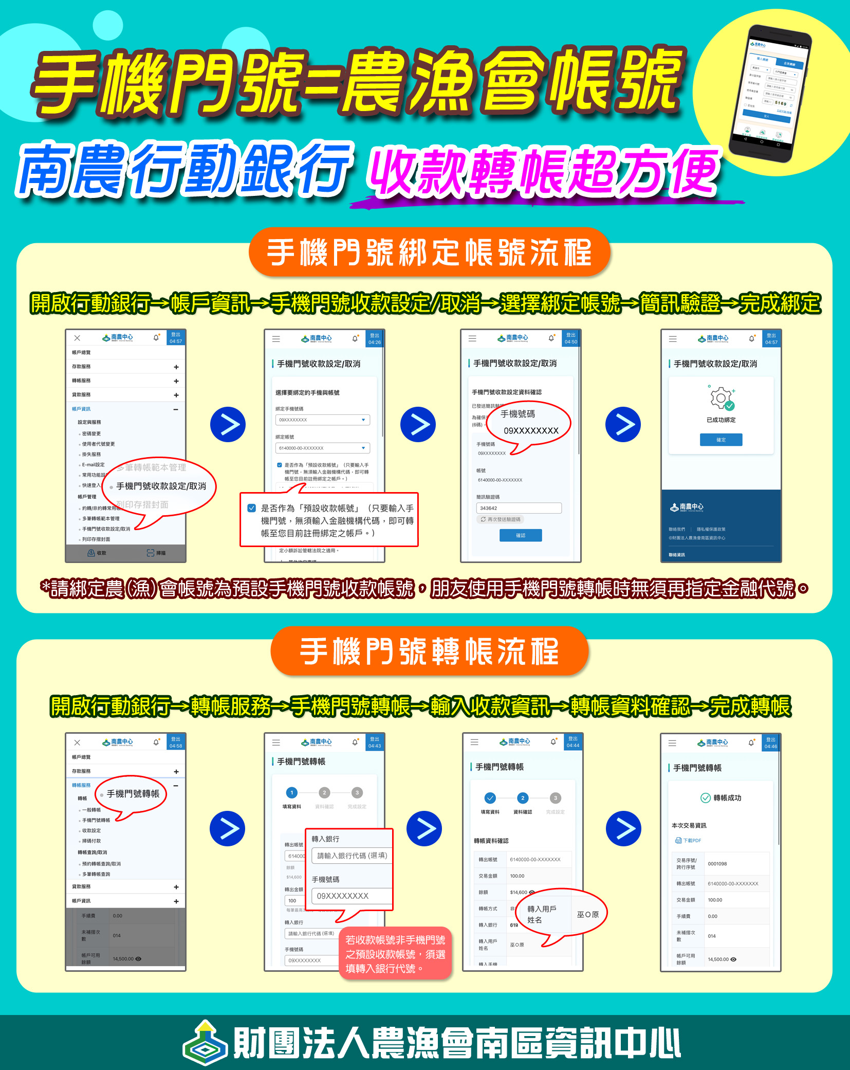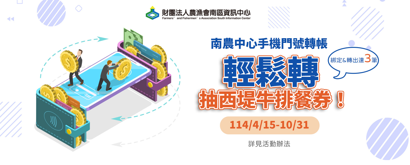 1. 本活動所指手機門號僅限用戶使用本國10碼之門號,並須透過「南農行動銀行APP」或「台灣行動支付APP(須使用本中心會員單位發行之金融卡)」完成手機門號轉帳。