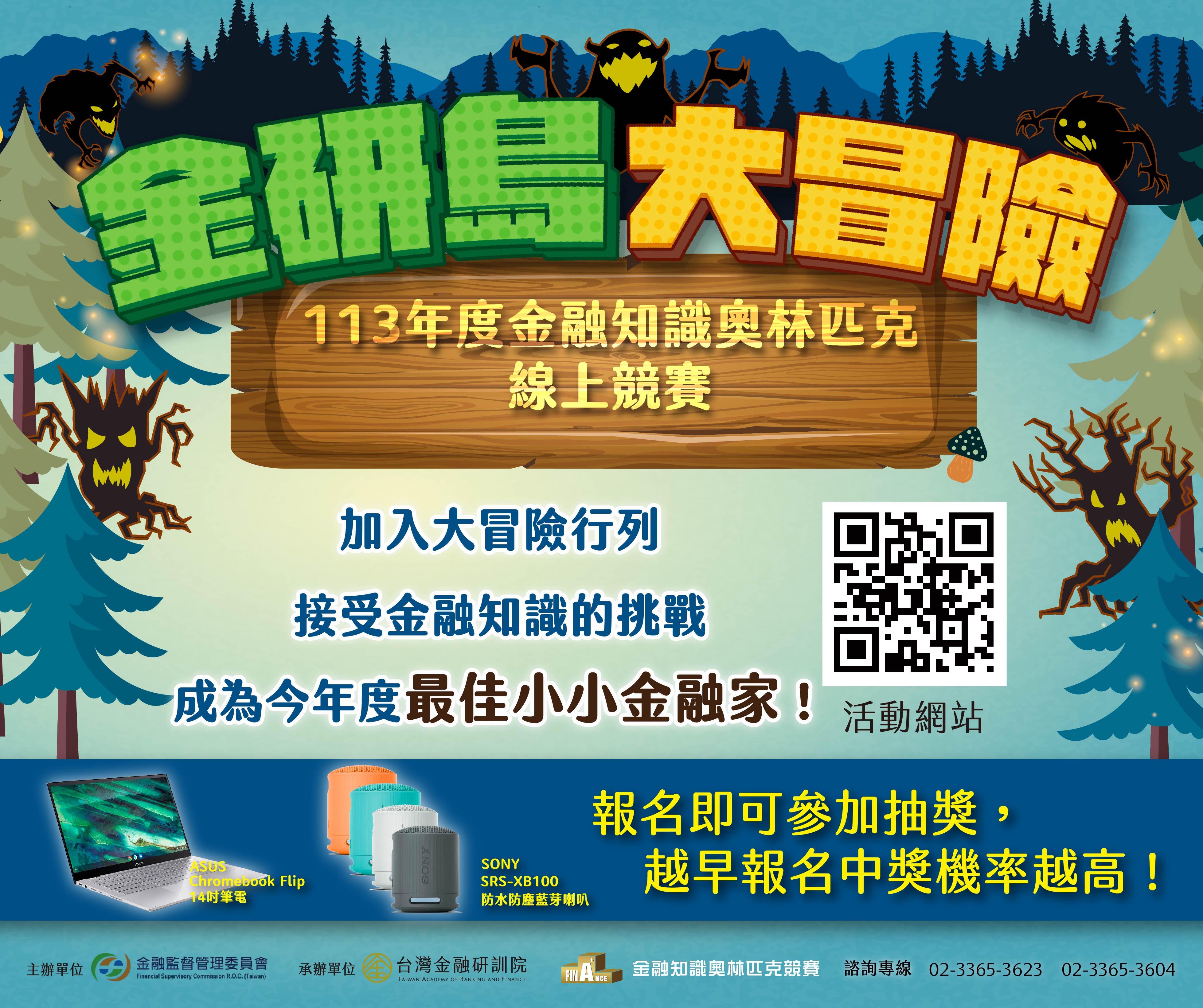 金融監督管理委員會為推動金融知識普及、強化學生金融素養,特委託金融研訓院舉辦「113年度金融知識線上競賽」,活動報名期間:113年9月2日至113年10月20日。活動詳情請洽官方網站:https://financeknowledge.tabf.org.tw/