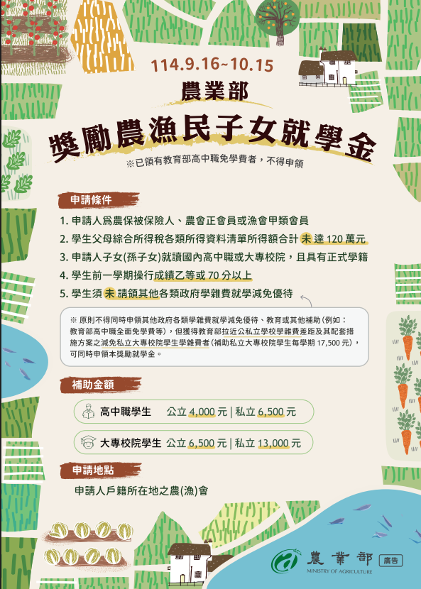 申請時間:114年9月16日~10月15日 申請資格:參加農民健康保險的被保險人或農會正會員