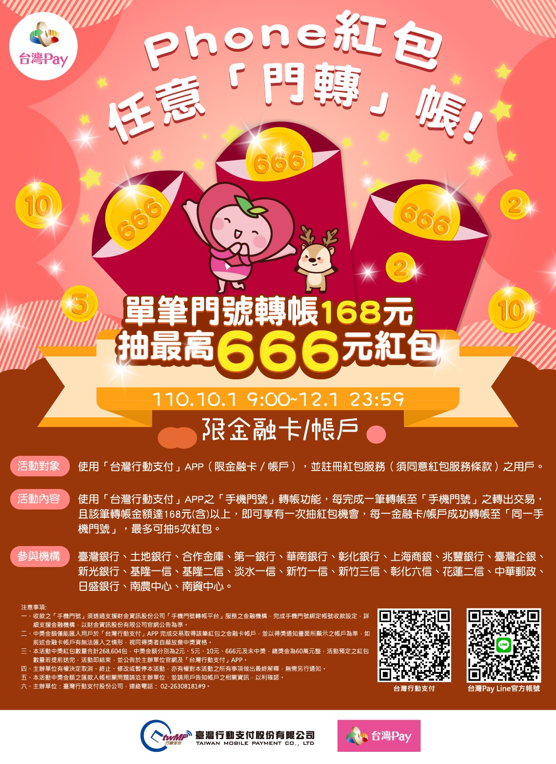Phone紅包 任意「門轉」帳! 2021-10-01 壹、活動名稱 Phone紅包 任意「門轉」帳! 貳、活動規劃 活動期間:自民國(以下同)110年10月1日上午9時整至110年12月1日下午11時59分止。 活動對象:使用「台灣行動支付」APP(限金融卡/帳戶),並註冊紅包服務(須同意紅包服務條款,註冊方式詳如附圖)之用戶(以下簡稱用戶)。 活動內容: (一) 使用「台灣行動支付」APP之「手機門號」轉帳功能,每完成一筆轉帳至「手機門號」之轉出交易,且該筆轉帳金額達新臺幣(以下同)168元(含)以上,即可享有一次抽紅包機會,每一金融卡/帳戶成功轉帳至「同一手機門號」,最多可抽5次紅包。 (二) 本活動收款之「手機門號」須透過支援財金資訊股份公司「手機門號轉帳平台」服務之金融機構,完成手機門號綁定帳號收款設定,支援金融機構如下,如有更新或異動,以財金資訊股份有限公司官網公告為準,不另行通知: 臺灣銀行、土地銀行、合作金庫、第一銀行、華南銀行、彰化銀行、上海銀行、高雄銀行、兆豐銀行、台中銀行、京城銀行、陽信銀行、新竹一信、三信銀行、花蓮二信、農金資訊、中華郵政、聯邦銀行、遠東銀行、元大銀行、永豐銀行、玉山銀行、凱基銀行、南農中心,計24家金融機構。 (三) 本活動中獎紅包數量合計有268,604包,中獎金額分別為2元、5元、10元、666元及未中獎,本活動總獎金為60萬元整,活動預定之紅包數量若提前送完,活動旋即結束並公告於臺灣行動支付公司官網及「台灣行動支付」APP。 參與金融機構: 透過「台灣行動支付」APP參與本活動之金融機構如下,如有更新或異動,以主辦單位官網公告為準: 臺灣銀行、土地銀行、合作金庫、第一銀行、華南銀行、彰化銀行、上海商銀、兆豐銀行、臺灣企銀、新光銀行、基隆一信、基隆二信、淡水一信、新竹一信、新竹三信、彰化六信、花蓮二信、中華郵政、日盛銀行、南農中心、南資中心,計21家金融卡發卡機構。 活動限制: (一) 本活動以實際成功交易計算,轉帳失敗、付款失敗、取消、退貨等交易不列入計算範圍。主辦單位保有審查之權利,用戶於退貨或交易後之沖正前如有領取本活動之贈獎,主辦單位得取消其參加或中獎之資格,並得追回本活動贈獎金額。 (二) 中獎金額僅能匯入用戶於「台灣行動支付」APP完成交易取得該筆紅包之金融卡帳戶(用戶無法指定匯入APP內其他已綁定之金融卡帳戶),並以中獎通知畫面所顯示之帳戶為準,如前述金融卡帳戶有無法匯入之情形(包含但不限於帳戶結清、警示戶、系統網路或有其他因素導致無法入帳等情形),視同中獎者自願放棄中獎資格,且不再另行通知及補發獎金,用戶不得異議或請求賠償。 (三) 執行紅包贈獎時,用戶參加本活動使用之「台灣行動支付」APP及其綁定之行動卡片須為有效,若上述任一非為有效狀態,將喪失中獎資格。 (四) 本活動將以「台灣行動支付」APP推播通知用戶,倘用戶於活動期間未註冊紅包服務、關閉推播通知、更換手機/門號、重新註冊、手機維修、手機重置、未於活動期間內開啟紅包(逾時未開啟者則喪失中獎資格,不得異議)等,將無法收到中獎通知或導致中獎通知遺失。若因上述因素導致未收到中獎通知,視同中獎者自願放棄中獎資格,將不予提供任何獎金,用戶不得異議或請求賠償。 (五) 本活動僅限「依中華民國公司法設立登記且其營業處所在台灣」之「國內地區(臺澎金馬)或國內網域網站」購物交易,不包含淘寶購物及天貓購物等跨境網域網站交易。 注意事項: (一) 本活動紅包為機會中獎獎金,用戶參加活動不代表即可獲獎。 (二) 各參與金融機構及主辦單位並未介入商品、服務之提供、交付或買賣等實體法律關係,不負擔任何瑕疵擔保或賠償責任,有關各項商品、服務之退換貨或瑕疵擔保所衍生之相關爭議事宜,請用戶逕洽各消費店家處理。 (三) 用戶需保證所有填寫或提出之資料均為真實且正確,並未冒用或盜用他人資料,如有不實或不正確資訊,主辦單位將取消其參加/中獎資格,並就其損害主辦單位或任何第三人權益,得提起訴追。如因資料不全或錯誤,致無法通知活動相關訊息或送達獎金者,相關損失由參加/中獎者自行承擔,主辦單位概不負責。中獎者逾活動期限未完成領取,或未回覆、未提供正確資料或資料填寫不完整、不清楚、不接受開立扣繳憑單者,視同放棄中獎資格。 (四) 用戶同意其所留存或產生之任何參與本活動的資料及記錄,皆以主辦單位之電腦系統與時間之紀錄為主。如有任何因電腦、網路、電話、技術或其他不可歸責於主辦單位之事由,致用戶資料有延遲、遺失、錯誤、無法辨識或毀損之情況,主辦單位不負責任何法律責任,用戶不得異議或請求賠償。 (五) 主辦單位就本活動用戶之資格,保有審查之權利,用戶於參加本活動之同時,即同意接受本活動所有規範內容,經查核若有不符本活動之規定者,主辦單位得取消其參加之資格。 (六) 主辦單位有權檢視各交易行為及中獎情況是否有人為操作之情形,對於有偽造、詐欺或冒名等行為,或以其他不正當方式意圖兌領者,經查證屬實,主辦單位除有權撤銷其參加/中獎資格或排除其參與本活動外,並得保留追訴權。 (七) 依中華民國稅法規定,中獎者若為中華民國境內居住之個人,中獎金額 (價值)超過1,000元以上者,需繳交身分證正反面影本供報稅使用,年度報稅時將計入個人