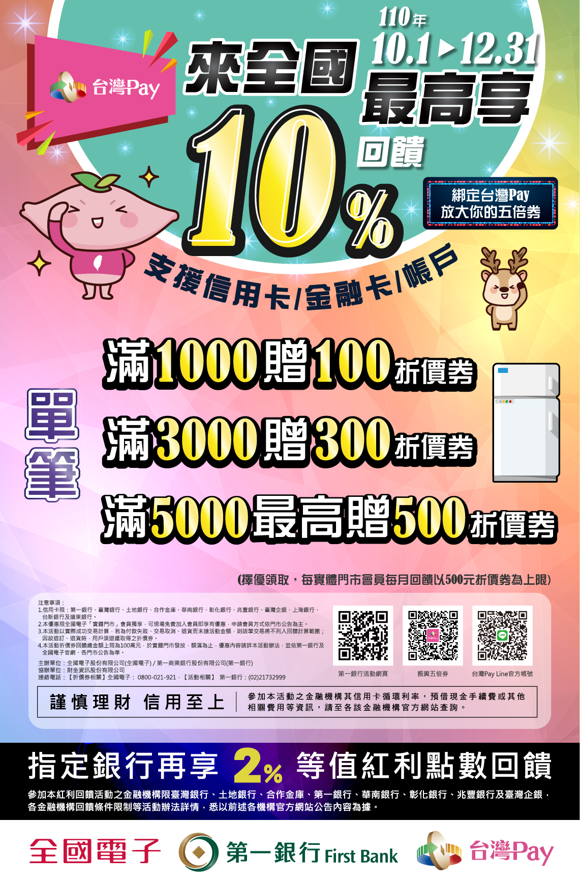 台灣Pay來全國 最高享10%回饋 2021-10-01 壹、活動名稱 台灣Pay來全國 最高享10%回饋 貳、活動規劃 活動期間:自110年10月1日起至110年12月31日。 活動對象:使用「台灣Pay」(透過參與金融機構「行動銀行」APP 或「台灣行動支付」APP)於活動地點消費,以「台灣Pay」付款條碼 (金融卡/帳戶/信用卡)進行支付之「全國電子」實體門市會員(以下簡稱用戶)。 活動地點:「全國電子」各實體門市,門巿據點依「全國電子」官網為準。 活動內容: (一) 用戶於活動期間內,使用「台灣Pay」付款條碼進行支付,單筆消費滿新臺幣(以下同)1,000元(含)以上即可獲得100元「全國電子」折價券,單筆滿3,000元(含)即可獲得300元折價券,單筆滿5,000元(含)即可獲得500元折價券,每筆擇優最高回饋500元折價券(單筆交易不得拆付),本活動之折價券將於實體門市發放並現場點交簽收。 (二) 活動期間內每位會員(依會員編號)每月回饋以500元折價券為上限,折價券僅限於下次消費進行折抵,本活動折價券回饋總金額上限為100萬元,額滿為止。 參與金融機構:透過「行動銀行」APP或「台灣行動支付」APP之參與機構如下,如有更新則以「台灣Pay」官網(taiwanpay.com.tw)為準,不另行通知。 (一)信用卡: 臺灣銀行、土地銀行、合作金庫、第一銀行、華南銀行、彰化銀行、兆豐銀行、臺灣企銀、上海銀行、台新銀行及遠東銀行,計11家金融機構。 (二)金融卡/帳戶:「行動銀行」APP 或「台灣行動支付」APP 之參與機構如下,如有更新則以「台灣Pay」官網(taiwanpay.com.tw)為準,不另行通知。 a.「行動銀行」APP之參與機構: 臺灣銀行、土地銀行、合作金庫、第一銀行、華南銀行、彰化銀行、高雄銀行、兆豐銀行、臺灣企銀、華泰銀行、陽信銀行、淡水一信、台中二信、三信銀行、農金資訊(農漁行動達人)、中華郵政(郵保鑣)、元大銀行、永豐銀行(豐錢包)、玉山銀行,計19家金融機構。 b.「台灣行動支付」APP 之參與機構: 臺灣銀行、土地銀行、合作金庫、第一銀行、華南銀行、彰化銀行、上海商銀、兆豐銀行、台灣企銀、新光銀行、基隆一信、基隆二信、淡水一信、新竹一信、新竹三信、彰化六信、花蓮二信、中華郵政、日盛銀行、南農中心、南資中心,計21家發卡機構。 活動限制: (一) 本活動之活動對象以「全國電子」實體門市會員為限,請至「全國電子」實體門巿填妥基本資料,免費申請加入會員,詳細申請方式及規定均依「全國電子」實體門市公告為準。 (二) 本活動消費金額需全額使用台灣Pay進行支付,符合本活動條件之用戶,於結帳時即可獲得折價券,於下次使用折價券進行消費折抵時,須將折價券交由門巿人員回收。 (三) 本活動以實際成功交易計算,若為付款失敗、交易取消、退貨而未達活動金額,則該筆交易將不列入回饋計算範圍;因故退訂、退貨時,用戶須退還取得之折價券。 (四) 本活動折價券回饋總金額上限為100萬元,如達限額,將提前結束本活動,並公告於「全國電子」及第一銀行官網及台灣Pay官網。 (五) 使用「全國電子」折價券須遵守下列使用規範,其餘折價券使用規定應依「全國電子」公告為準: 1. 限「全國電子」實體門市提供之紙本折價券始得進行消費折抵,影印及手機出示折價券均不得進行折抵,遺失、毀損恕不補發。 2. 使用折價券消費差額不找零;本活動折價券若與其他活動併行,須先行扣除折價券額度。 3. 本活動折價券使用期間一年,以門市店章日期之次日起算,倘逾期將無法使用;紙本折價券亦不得折換現金或換取等值禮?。 注意事項: (一) 本活動用戶結帳金額,以「全國電子」門市計算金額為準,各參與金融機構及協辦單位並未介入商品、服務之提供或交付、或商品服務買賣等實體法律關係,不負擔任何瑕疵擔保或賠償責任,相關商品退換貨或瑕疵擔保所衍生之相關爭議事宜,皆由「全國電子」處理。 (二) 用戶須同意遵守「全國電子」折價券各項條款及相關規定,第一銀行對用戶領取或使用之紙本折價券不負任何瑕疵擔保或賠償責任,皆由「全國電子」處理。 (三) 主、協辦單位就用戶之資格、交易成功與否等,保有審查之權利,經查核若有不符本活動之規定者,主、協辦單位得取消其參加資格,並得追回折價券或請求損害賠償。 (四) 用戶同意其所留存或產生之任何參與本活動的資料及紀錄,皆以主、協辦單位或發卡機構之電腦系統與時間為準。 (五) 對於以偽造、詐欺、冒名或其他不正當方式意圖兌領之用戶,經查證屬實者,主辦單位有權排除其參與本活動,並得保留法律追訴權。 (六) 用戶已充分知悉且同意就本活動提供之個人資料,主、協辦單位得於本活動範圍內進行蒐集、處理及利用。 (七) 其它未盡事宜應以主、協辦單位活動訊息頁面為準,主、協辦單位有權決定取消、終止、修改或暫停本活動,亦有權對本活動之所有事項做出最終解釋,無須另行通知。 (八) 主辦單位:全國電子股份有限公司(全國電子)、第一商業銀行股份有限公司(第一銀行) 協辦單位:財金資訊股份有限公司 連絡電話:【折價券相關】全國電子: 0800-021-921 【活動相關】 第一銀行:(02)21732999 上一則 回到列表 下一則