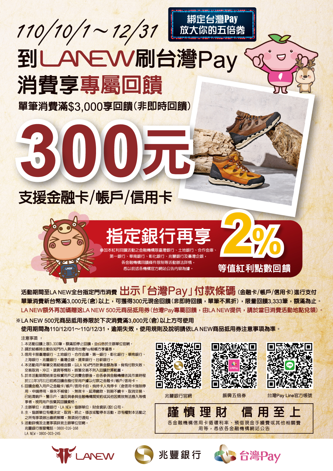 到LA NEW刷台灣Pay 消費享專屬回饋 2021-10-01 壹、活動名稱 到LA NEW刷台灣Pay 消費享專屬回饋 貳、活動規劃 活動期間:自110年10月1日起至110年12月31日。 活動對象:使用「台灣Pay」(透過參與金融機構「行動銀行」APP或「台灣行動支付」APP)於活動期間至活動地點消費,出示「台灣Pay」付款條碼(金融卡/帳戶/信用卡)進行支付之用戶(下稱「用戶」)。 活動地點:LA NEW指定門市,參與活動門市據點詳如附表。如有異動,以LA NEW官網(https://www.lanew.com.tw/)公告為準,不另行通知。 活動內容: 活動期間至活動地點消費,出示「台灣Pay」付款條碼(金融卡/帳戶/信用卡)進行付款,單筆交易結帳金額滿新臺幣(下同)3,000元(含)以上,可獲得300元現金回饋(非即時回饋,單筆不累折,下稱「回饋金」),限量回饋共3,333筆,額滿為止,並公告於主辦單位官網;另LA NEW額外再加碼贈送LA NEW 500元商品抵用券(台灣Pay專屬回饋,由LA NEW提供,請於當日消費活動地點兌領)。 ※LA NEW 500元商品抵用券限於下次消費滿3,000元(含)以上方可使用,使用期間為110/12/01~110/12/31,逾期失效,使用規則及說明請依LA NEW商品抵用券注意事項為準。 參與金融機構:透過「行動銀行」APP或「台灣行動支付」APP之參與機構如下,如有更新則以「台灣Pay」官網(taiwanpay.com.tw)為準,不另行通知。 (一)信用卡: 臺灣銀行、土地銀行、合作金庫、第一銀行、彰化銀行、華南銀行、上海銀行、兆豐銀行、臺灣企銀、遠東銀行及台新銀行,計11家金融機構。 (二)金融卡/帳戶:「行動銀行」APP 或「台灣行動支付」APP 之參與機構如下,如有更新則以「台灣Pay」官網(taiwanpay.com.tw)為準,不另行通知。 a.「行動銀行」APP之參與機構: 臺灣銀行、土地銀行、合作金庫、第一銀行、華南銀行、彰化銀行、高雄銀行、兆豐銀行、臺灣企銀、華泰銀行、陽信銀行、淡水一信、台中二信、三信銀行、農金資訊(農漁行動達人)、中華郵政(郵保鑣)、元大銀行、永豐銀行(豐錢包)、玉山銀行,計19家金融機構。 b.「台灣行動支付」APP 之參與機構: 臺灣銀行、土地銀行、合作金庫、第一銀行、華南銀行、彰化銀行、上海商銀、兆豐銀行、臺灣企銀、新光銀行、基隆一信、基隆二信、淡水一信、新竹一信、新竹三信、彰化六信、花蓮二信、中華郵政、日盛銀行、南農中心、南資中心,計21家金融機構。 活動限制: (一) 本活動就符合活動條件之用戶將依交易時序核算回饋資格,且單筆金額不得拆刷,活動期間限量回饋3,333筆,活動總回饋金額為100萬元,如達本活動回饋總筆數或總金額上限時,即停止回饋,並公告於主辦單位官網。 (二) 本活動用戶單筆交易結帳金額,以LA NEW門市計算金額為準。倘有付款失敗、交易取消、沖正、退貨等情形,該筆交易不列入回饋計算範圍。 (三) 於本活動期間結束並核實用戶之消費金額後,由各參與金融機構依其作業時程於111年3月31日前將回饋金撥付至用戶據以付款之金融卡/帳戶/信用卡。 (四) 回饋金撥入用戶之金融卡/帳戶/信用卡前,倘持卡人有停卡(含信用卡強制停用、申請停用、掛失不補發)、無效卡、延滯繳款、到期不續卡、取消交易、已結清銷戶、警示戶、違反與參與金融機構間契約或其他因素致無法撥入等情事者,視同用戶放棄其回饋資格。 注意事項: (一) 各參與金融機構及財金資訊股份有限公司並未介入商品、服務之提供、交付或買賣等實體法律關係,不負擔任何瑕疵擔保或賠償責任,相關商品或服務之退換貨或瑕疵擔保所衍生之爭議事宜,悉由LA NEW門市處理。 (二) 主、協辦單位就用戶取得回饋金之資格(包括但不限於交易成功與否等),保有審查之權利,經其判斷不符本活動之回饋資格者(包括但不限於用戶構成下述第五項之情形),主、協辦單位得取消其回饋資格,並得追回回饋金。倘致主、協辦單位受有損害,主、協辦單位並得請求賠償。 (三) 用戶同意其因參與本活動所留存或產生之任何資料及紀錄,皆以主、協辦單位或各該參與金融機構之電腦系統與時間為準。 (四) 本活動用戶之資格或權益不得讓與他人,用戶亦不得要求變更回饋內容。 (五) 對於偽造、詐欺、冒名、拆單或其他不正當方式取得或意圖取得回饋金者,主、協辦單位有權取消其回饋資格,並得依法求償或訴追其刑事責任。 (六) 用戶已充分知悉且同意就本活動提供之個人資料,主、協辦單位得於本活動目的範圍內進行蒐集、處理、利用或國際傳輸,並遵守個人資料保護法相關規定辦理。 (七) 主、協辦單位有權決定取消、終止、修改或暫停本活動,且對本活動之所有事項有最終解釋權,不另行通知。 (八) 本活動其他未盡事宜以LA NEW門市公告或主、協辦單位活動訊息網頁之公告為準。 (九) 主辦單位:兆豐國際商業銀行股份有限公司、老牛皮國際股份有限公司(LA NEW) 協辦單位:財金資訊股份有限公司 連絡電話:兆豐國際商業銀行 0800-016-168 LA NEW 0800-003-245 上一則 回到列表 下一則