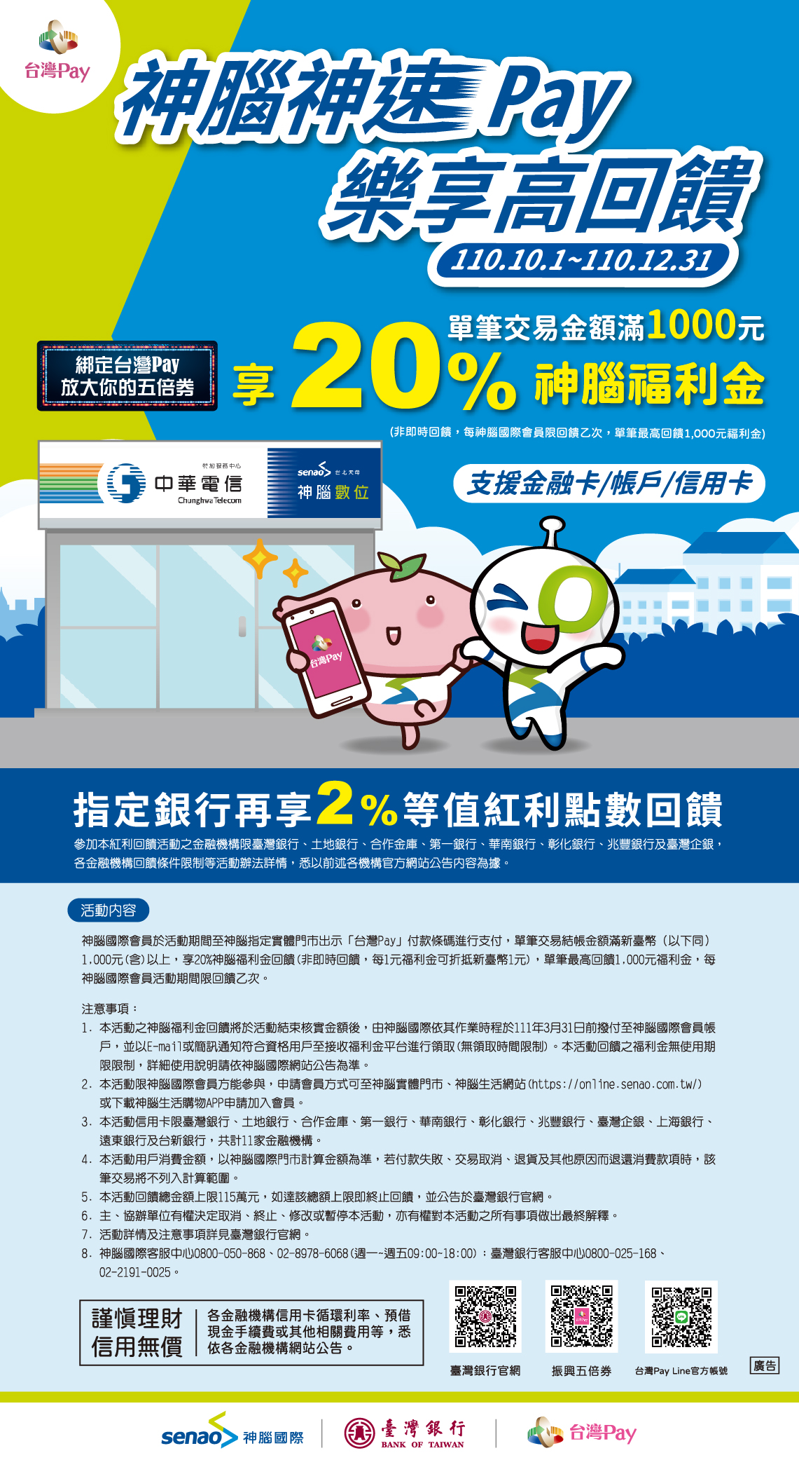 神腦神速Pay,樂享高回饋 2021-10-01 壹、活動名稱 神腦神速Pay,樂享高回饋 貳、活動規劃 活動期間:自110年10月1日起至110年12月31日。 活動對象:使用「台灣Pay」(透過參與金融機構「行動銀行」App或「台灣行動支付」App),於活動地點出示「台灣 Pay」付款條碼(金融卡/帳戶/信用卡)進行支付之神腦國際會員(以下簡稱用戶)。 活動地點:神腦國際受理「台灣Pay」之指定實體門市(參與活動門市據點請詳附表,如有更新以神腦國際官網公告為準)。 活動內容: 神腦國際會員於活動期間至活動地點出示「台灣Pay」付款條碼進行支付,單筆消費金額滿新臺幣(以下同)1,000元(含)以上,享20%神腦福利金回饋(非即時回饋,每1元福利金可折抵新臺幣1元),每神腦國際會員活動期間限回饋乙次,單筆最高回饋1,000元福利金。本活動回饋總金額上限115萬元,如達該總額上限即終止回饋,並公告於臺灣銀行官網。 參與金融機構: (一)信用卡: 臺灣銀行、土地銀行、合作金庫、第一銀行、華南銀行、彰化銀行、兆豐銀行、臺灣企銀、上海銀行、遠東銀行及台新銀行,計11家金融機構。 (二)金融卡/帳戶:「台灣Pay」掃碼支付(透過「行動銀行」APP或「台灣行動支付」APP)之參與機構如下,如有更新則以「台灣Pay」官網(taiwanpay.com.tw)為準,不另行通知。 a.「行動銀行」APP之參與機構: 臺灣銀行、土地銀行、合作金庫、第一銀行、華南銀行、彰化銀行、高雄銀行、兆豐銀行、臺灣企銀、華泰銀行、陽信銀行、淡水一信、台中二信、三信銀行、農金資訊(農漁行動達人)、中華郵政(郵保鑣)、元大銀行、永豐銀行(豐錢包)、玉山銀行,計19家金融機構。 b.「台灣行動支付」APP 之參與機構: 臺灣銀行、土地銀行、合作金庫、第一銀行、華南銀行、彰化銀行、上海銀行、兆豐銀行、臺灣企銀、新光銀行、基隆一信、基隆二信、淡水一信、新竹一信、新竹三信、彰化六信、花蓮二信、中華郵政、日盛銀行、南農中心、南資中心,計21家發卡機構。 活動限制: (一) 本活動限神腦國際會員方能參與,申請會員方式可至神腦實體門市、神腦生活網站(https://online.senao.com.tw/) 或下載神腦生活購物APP申請加入會員。 (二) 本活動用戶消費金額,以神腦國際門市計算金額為準,若付款失敗、交易取消、退貨及其他原因而退還消費款項時,該筆交易將不列入計算範圍,回饋金額以「結帳時實際支付金額x 20%」計算,小數點後四捨五入。 (三) 電子票證現金儲值、代收/售、購買預付卡/加值卡、或神腦國際實體門市標示或公告之指定排除商品等,皆不列入消費門檻之金額計算。 (四) 本活動回饋恕不與其他贈點活動併行且福利金無法贈送至非符合交易資格之神腦國際會員帳戶。 (五) 本活動之神腦福利金回饋將於活動結束核實金額後,由神腦國際依其作業時程於111年3月31日前撥付至神腦國際會員帳戶,並以E-mail或簡訊通知符合資格用戶至https://bbms.senao.com.tw/#/pages/receive進行領取(領取時間無期限限制)。本活動回饋之福利金無使用期限限制,詳細使用說明請依神腦國際網站(https://online.senao.com.tw/FAQ/home/36)公告為準。 注意事項: (一) 各參與金融機構及協辦單位並未介入商品、服務之提供或交付或買賣等實體法律關係,不負擔任何瑕疵擔保或賠償責任,神腦國際實體門市提供之各項商品、服務之退換貨或瑕疵擔保所衍生之相關爭議事宜,悉由神腦國際處理。 (二) 主、協辦單位就用戶之資格、交易成功與否等,保有審查之權利,經查核若有不符本活動之規定者,主、協辦單位得取消其參加資格,並得追回回饋金。 (三) 用戶同意其所留存或產生之任何參與本活動的資料及紀錄,皆以主、協辦單位或發卡機構之電腦系統與時間為準。 (四) 對於以偽造、詐欺、冒名或其他不正當方式意圖兌領之用戶,經查證屬實者,主、協辦單位有權排除其參與本活動,如因此造成主、協辦單位損害,將依法對該用戶請求損害賠償。 (五) 用戶已充分知悉且同意就本活動提供之個人資料,主、協辦單位僅於此次活動範圍內進行蒐集、處理及利用,且遵守【個人資料保護法】相關規定辦理。 (六) 主、協辦單位有權決定取消、終止、修改或暫停本活動,亦有權對本活動之所有事項做出最終解釋,若有其他未盡事宜,應依神腦國際網站公告或主、協辦單位活動網站上公告為準,無須另行通知。 (七) 主辦單位:臺灣銀行(股)公司、神腦國際企業(股)公司 協辦單位:財金資訊(股)公司 連絡電話:神腦國際客服中心 0800-050-868、02-8978-6068(週一~週五09:00~18:00) 臺灣銀行客服中心0800-025-168、02-2191-0025 上一則 回到列表 下一則