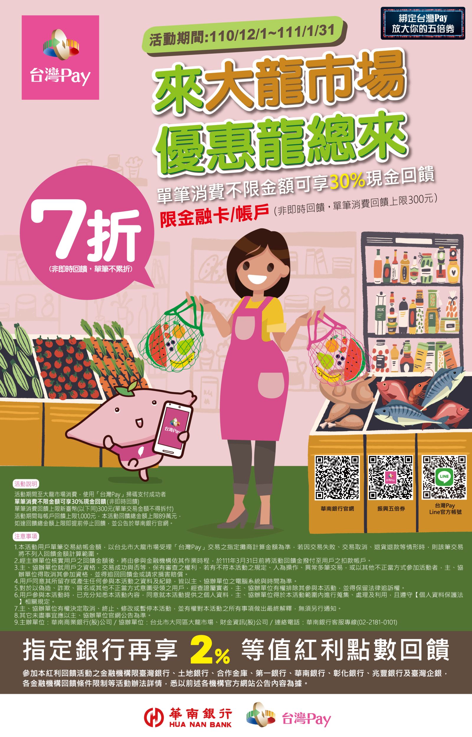 來大龍市場,優惠龍總來 2021-12-01 來大龍市場,優惠龍總來 單筆消費不限金額可享 30%之現金回饋,單筆消費回饋上限新臺幣300 元。 | 活動時間 | 2021/12/01 - 2022/01/31 | 活動地點 | 台北市大龍市場受理「台灣 Pay」交易之指定攤商。(指定攤商資料以華南銀行官網公告為準)。 | 活動對象 | 透過參與金融機構「行動銀行」APP 或「台灣行動支付」APP(限金融卡/帳戶),於活動地點使用「台灣 Pay」掃碼支付之持卡人(以下簡稱用戶)。 | 活動內容 | 用戶於活動期間至活動地點消費,使用「台灣 Pay」掃碼支付成功者,單筆消費不限金額可享 30%之現金回饋(小數點四捨五入,非即時回饋),單筆消費回饋上限新臺幣(以下同)300 元(單筆交易金額不得拆付),活動期間每卡號/帳戶回饋上限 1,000 元,本活動回饋總金額上限 89 萬元,如達回饋總金額上限,即提前停止回饋,並公告於主辦單位官網。 上一則 回到列表 下一則