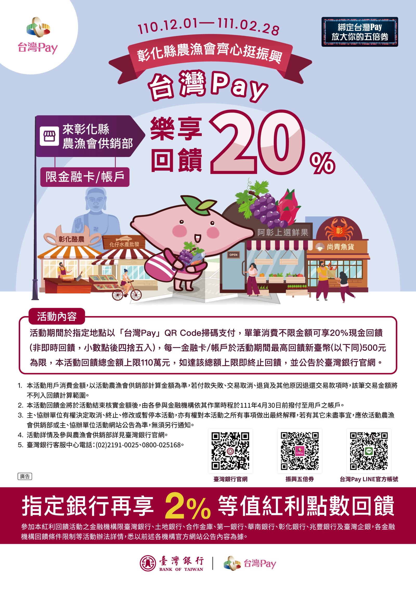 彰化縣農漁會齊心挺振興,台灣Pay作伙加碼20%揪甘心 2021-12-01 彰化縣農漁會齊心挺振興,台灣Pay作伙加碼20%揪甘心 單筆消費不限金額可享20%現金回饋,最高回饋新臺幣500元為限。 | 活動時間 | 2021/12/01 - 2022/02/28 | 活動地點 | 彰化縣農漁會供銷部(參與活動之農漁會供銷部詳見附表,如有更新以臺灣銀行官網公告為準)。 | 活動對象 | 使用「台灣Pay」(透過參與金融機構「行動銀行」APP 或「台灣行動支付」APP)至活動地點消費,進行QR Code掃碼支付(限金融卡/帳戶)之用戶。 | 活動內容 | 活動期間於活動地點以「台灣Pay」QR Code掃碼支付,單筆消費不限金額可享20%現金回饋(非即時回饋,小數點後四捨五入),每一金融卡/帳戶於活動期間最高回饋新臺幣(以下同)500元為限,本活動回饋總金額上限110萬元,如達該總額上限即終止回饋,並公告於臺灣銀行官網。 上一則 回到列表 下一則