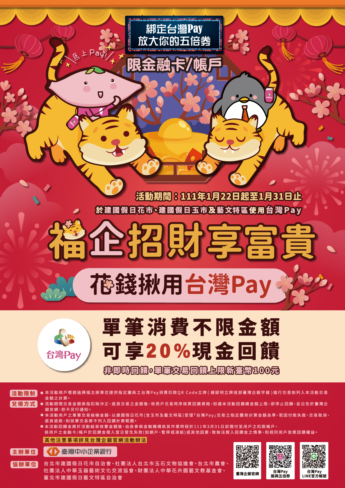 福「企」招財享富貴 花錢揪用台灣Pay 2022-01-22 福「企」招財享富貴 花錢揪用台灣Pay 單筆消費不限金額可享20%現金回饋,單筆回饋上限新臺幣100元。 | 活動時間 | 2022/01/22 - 2022/01/31 | 活動地點 | 台北市建國假日花市(含玉市及藝文特區)受理「台灣Pay」交易之指定攤商。(指定攤商資料請以臺灣企銀官網為準)。 | 活動對象 | 使用「台灣Pay」(透過「行動銀行APP」或「台灣行動支付APP」) ,於活動地點使用QR Code掃碼支付(限金融卡/帳戶消費扣款功能)之持卡人(以下簡稱用戶)。 | 活動內容 | 活動期間用戶於活動地點以「台灣Pay」進行掃碼支付,單筆消費不限金額可享20%現金回饋(非即時回饋,金額小數點後四捨五入),單筆交易回饋上限新臺幣(以下同)100元(交易金額不得拆付),本活動回饋總金額上限30萬元,額滿為止。 上一則 回到列表 下一則