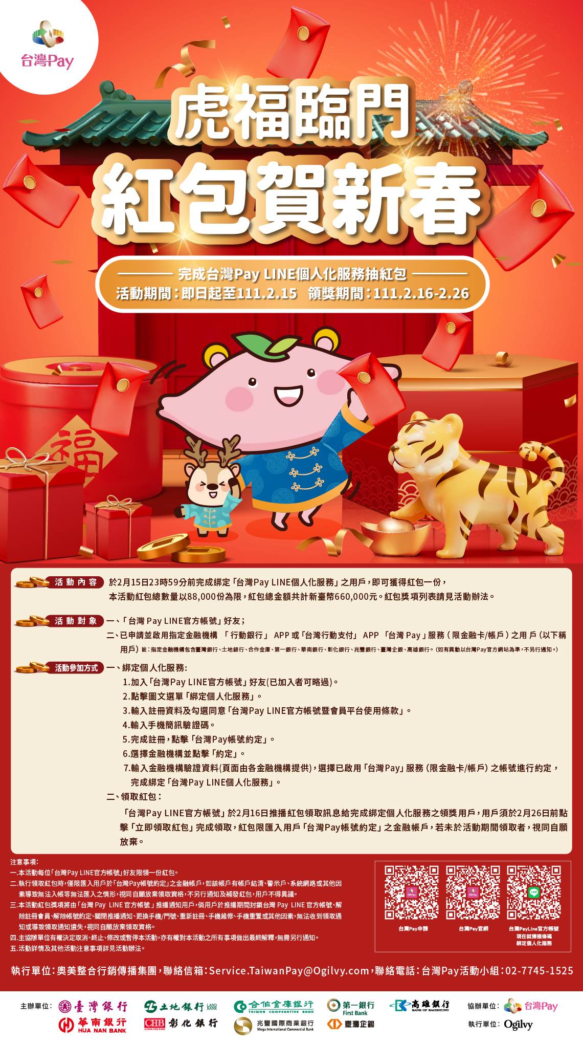 虎福臨門紅包賀新春 2022-01-20 虎福臨門紅包賀新春 用戶於2月15日前完成綁定「台灣Pay LINE個人化服務」,即可獲得紅包一份。 | 活動時間 | 2022/01/20 - 2022/02/15 | 活動對象 | 加入「台灣Pay LINE官方帳號」好友,且已申請並啟用指定金融機構「行動銀行」APP或「台灣行動支付」APP「台灣Pay」服務(限金融卡/帳戶)之用戶(以下稱用戶)。 指定金融機構:包含臺灣銀行、土地銀行、合作金庫、第一銀行、華南銀行、彰化銀行、兆豐銀行、臺灣企銀、高雄銀行。(如有異動以「台灣Pay」官方網站為準,不另行通知。) | 活動內容 | 用戶於2月15日23時59分前完成綁定「台灣Pay LINE個人化服務」,即可獲得紅包一份,本活動紅包總數量以88,000份為限,紅包總金額合計新臺幣66萬元。 上一則 回到列表 下一則