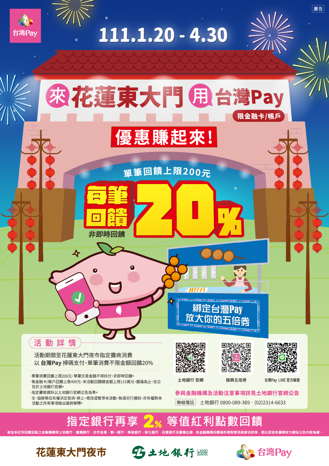 來花蓮東大門用台灣 Pay,優惠賺起來! 2022-01-20 來花蓮東大門用台灣 Pay,優惠賺起來! 消費不限金額可享20%之現金回饋,單筆消費回饋上限新臺幣200元,活動期間每卡號/帳戶回饋上限400元。 | 活動時間 | 2022/01/20 - 2022/04/30 | 活動地點 | 花蓮東大門國際觀光夜市(以下簡稱東大門夜市)受理「台灣 Pay」交易之指定攤商。(指定攤商資料如有更新請以主辦單位官網公告為準)。 | 活動對象 | 透過參與金融機構「行動銀行」APP 或「台灣行動支付」APP(限金融卡/帳戶),於活動地點使用「台灣 Pay」掃碼支付之用戶(以下稱用戶)。 | 活動內容 | 用戶於活動期間至活動地點消費,使用「台灣 Pay」掃碼支付成功者,單筆消費不限金額可享 20%之現金回饋(小數點後四捨五入,非即時回饋),單筆消費回饋上限新臺幣(以下同)200 元(單筆交易金額不得拆付),活動期間每卡號/帳戶回饋上限 400 元,本活動回饋總金額上限 115 萬元,如達回饋總金額上限,即停止回饋,並公告於主辦單位官網。 上一則 回到列表 下一則