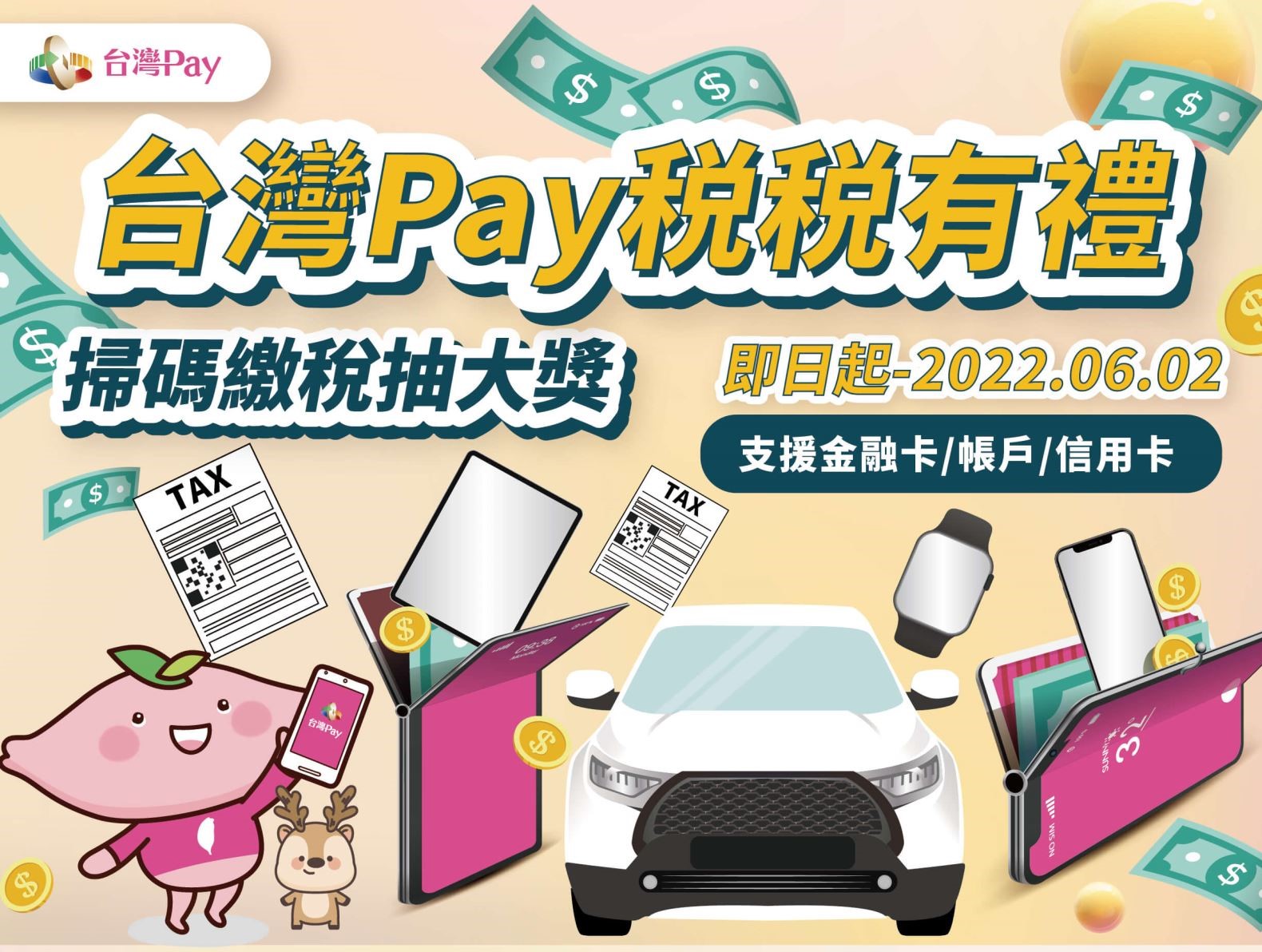 台灣Pay稅稅有禮 2022-03-20 台灣Pay稅稅有禮 使用台灣Pay掃描「110年度綜合所得稅」、「111年度汽機車牌照稅」及「111年度房屋稅」稅單上之QR Code進行繳稅,即可參加抽獎 | 活動時間 | 2022/03/20 - 2022/06/02 | 活動對象 | 使用「台灣Pay」(金融卡/帳戶/信用卡),透過「行動銀行」APP 或「台灣行動支付」APP進行掃碼繳稅之用戶(以下簡稱用戶)。 | 活動內容 | 於活動期間(繳納期間依稅務機關公告為準)使用「台灣Pay」掃描「110年度綜合所得稅」、「111年度汽機車牌照稅」及「111年度房屋稅」稅單上之QR Code進行繳稅,即可參加抽獎,獎項共有7大項,中獎名額總計279名。每成功繳納1張稅單即享有1次抽獎機會,成功繳納2張稅單即享有2次抽獎機會,以此類推;惟同一張稅單以多筆交易繳納者僅有1次抽獎機會;活動期間同一自然人僅限得一個獎項。 上一則 回到列表 下一則