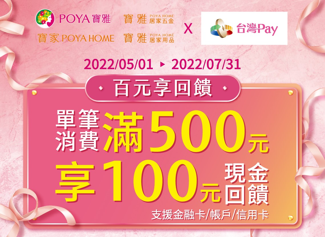 寶雅×台灣PAY,百元享回饋 2022-05-01 寶雅×台灣PAY,百元享回饋 滿新臺幣500元以上,可享100元現金回饋 | 活動時間 | 2022/05/01 - 2022/07/31 | 活動地點 | 寶雅(含寶家、寶雅居家五金、寶雅居家用品等品牌,以下稱寶雅)受理「台灣Pay」之指定實體門市(參與本活動之門市詳如附表,如有更新將以華南銀行官網公告為準,恕不另行通知)。 | 活動對象 | 使用「台灣Pay」(透過參與金融機構「行動銀行」App或「台灣行動支付」App)至活動地點,出示「台灣Pay」付款條碼(金融卡/帳戶/信用卡)進行支付之用戶(以下簡稱用戶)。 | 活動內容 | 用戶至活動地點消費,出示「台灣Pay」付款條碼進行支付,「單筆交易結帳金額」滿新臺幣(以下同)500元(含)以上,可享100元現金回饋(非即時回饋,單筆不累折,消費金額不得拆付)。活動期間每卡號/帳戶(信用卡/金融卡/帳戶)回饋上限為1000元。本活動回饋總金額上限115萬元,如達該總金額上限即終止回饋,並公告於華南銀行官網。 上一則 回到列表 下一則
