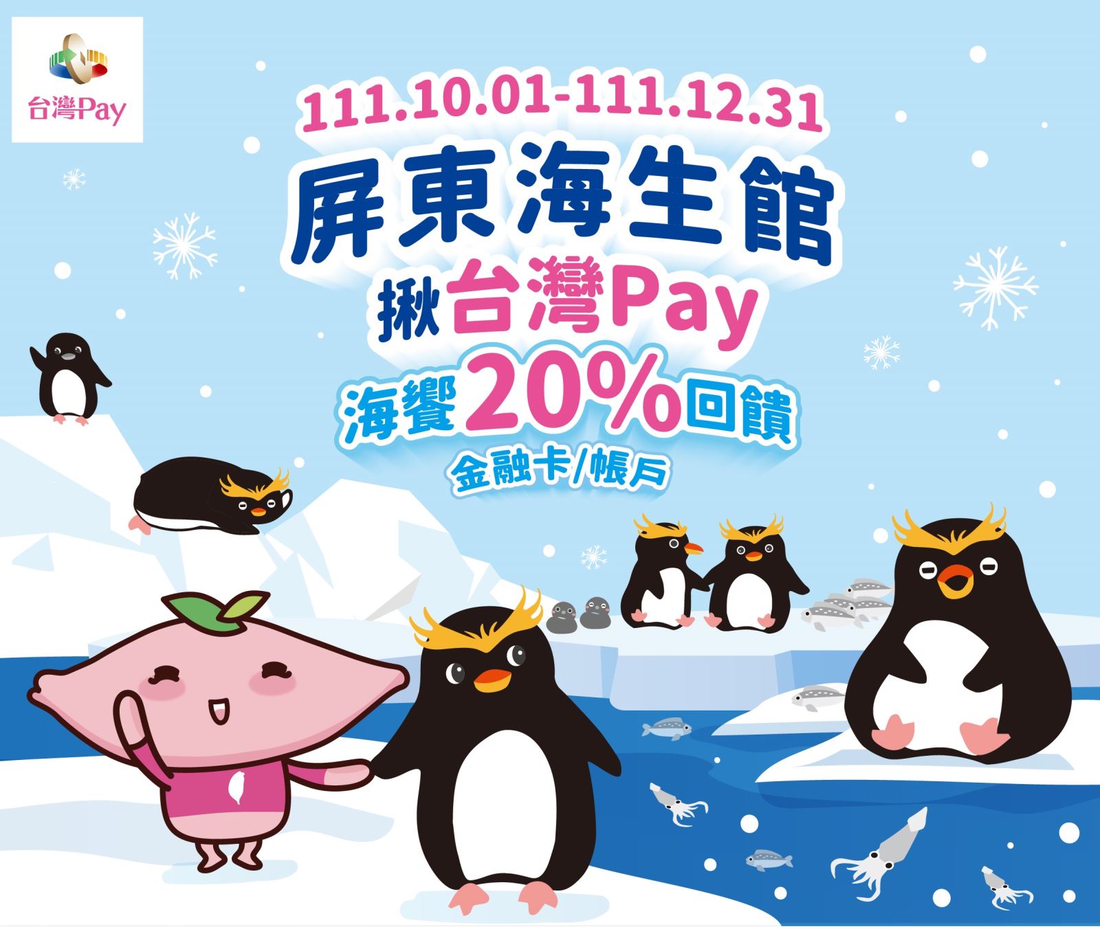 屏東海生館揪台灣Pay,海饗20%回饋 2022-10-01 屏東海生館揪台灣Pay,海饗20%回饋 單筆消費不限金額可享 20%之現金回饋 | 活動時間 | 2022/10/01 - 2022/12/31 | 活動地點 | 國立海洋生物博物館(屏東海生館)受理「台灣 Pay」交易之指定櫃位。(指定櫃位以華南銀行官網公告為準)。 | 活動對象 | 使用「台灣 Pay」(透過參與金融機構「行動銀行 APP」或「台灣行動支付 APP」),於活動地點消費,並出示「台灣 Pay」付款條碼(限金融卡/帳戶)進行支付之用戶(以下簡稱用戶)。 | 活動內容 | 用戶於活動期間至活動地點出示「台灣 Pay」付款條碼(限金融卡/帳戶)進行支付,單筆消費不限金額可享 20%之現金回饋(小數點四捨五入,非即時回饋),單筆消費回饋上限新臺幣(以下同)600元(單筆交易金額不得拆付),本活動回饋總金額上限55 萬元,如達回饋總金額上限,即提前停止回饋,並公告於華南銀行官網。 上一則 回到列表 下一則