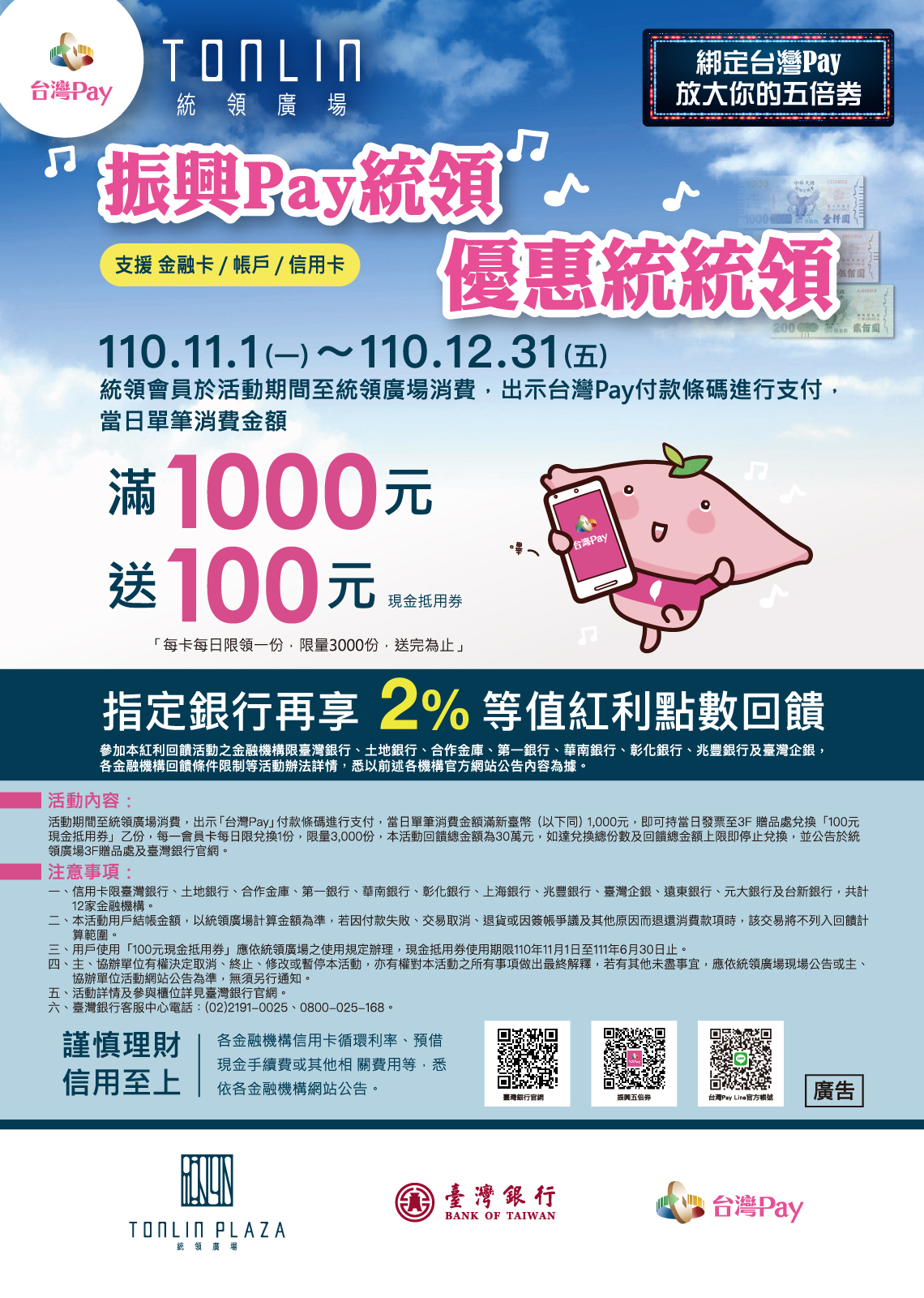 振興Pay統領 優惠統統領 2021-11-01 振興Pay統領 優惠統統領 當日單筆消費金額滿新臺幣1,000元,即可持當日發票至3F 贈品處兌換「100元現金抵用券」乙份。 | 活動時間 | 2021/11/01 - 2021/12/31 | 活動地點 | 統領廣場受理「台灣Pay」櫃位。 | 活動對象 | 使用「台灣Pay」(透過參與金融機構「行動銀行」APP或「台灣行動支付」APP),於活動地點出示「台灣Pay」付款條碼(金融卡/帳戶/信用卡)進行支付之統領廣場會員(以下簡稱用戶)。 | 活動內容 | 活動期間用戶至活動地點消費,出示「台灣Pay」付款條碼進行支付,當日單筆消費金額滿新臺幣(以下同)1,000元,即可持當日發票至3F 贈品處兌換「100元現金抵用券」乙份,每一會員卡每日限兌換1份,限量3,000份,本活動回饋總金額為30萬元,如達兌換總份數及回饋總金額上限即停止兌換,並公告於統領廣場3F贈品處及臺灣銀行官網。 上一則 回到列表 下一則