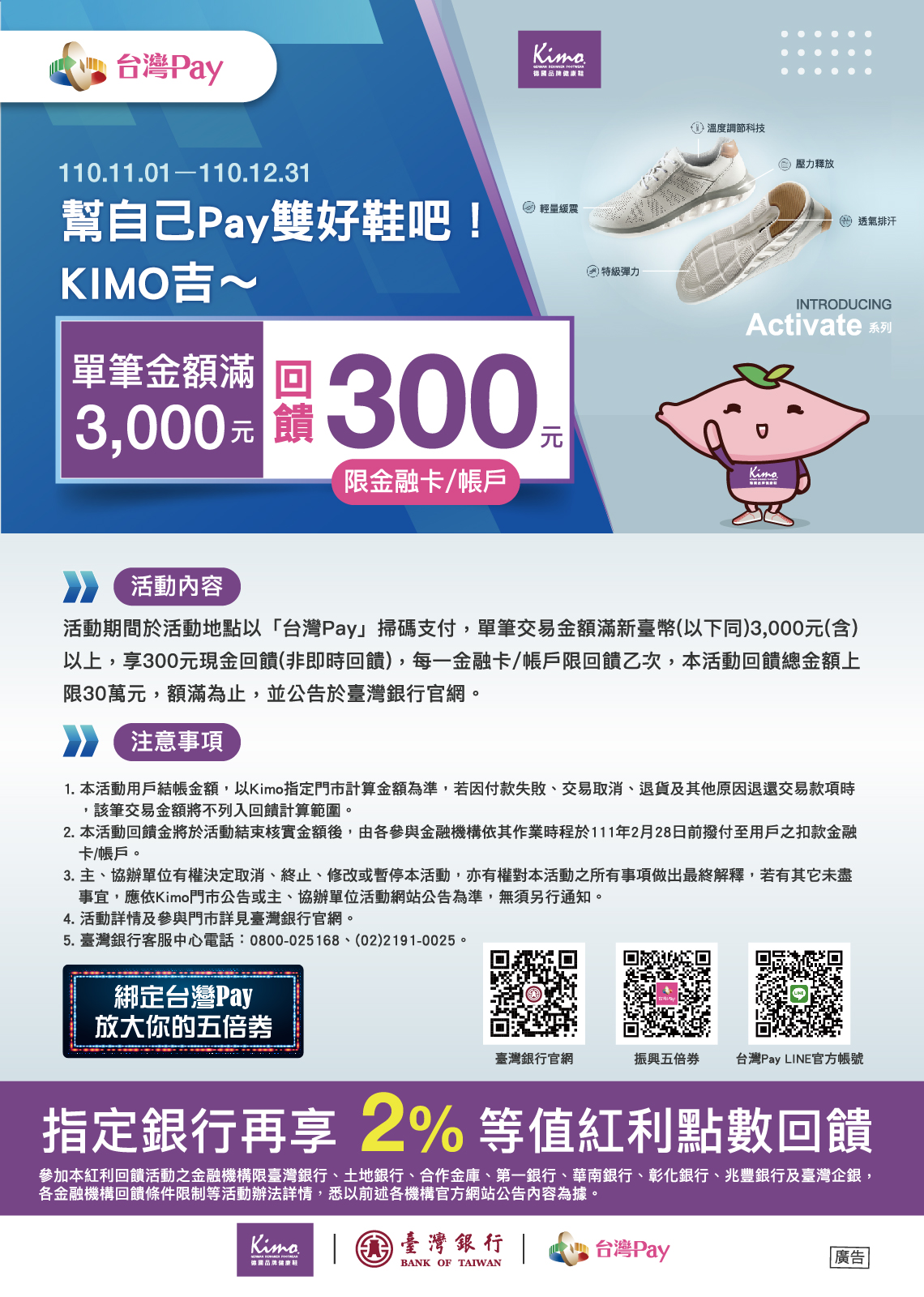 幫自己Pay雙好鞋吧!Kimo吉~ 2021-11-01 幫自己Pay雙好鞋吧!Kimo吉~ 單筆交易金額滿新臺幣3,000元,享300元現金回饋。 | 活動時間 | 2021/11/01 - 2021/12/31 | 活動地點 | Kimo受理「台灣Pay」之指定門市(參與活動門市如有異動以臺灣銀行官網公告為準)。 | 活動對象 | 使用台灣Pay(透過參與金融機構「行動銀行」APP或「台灣行動支付」APP)至活動地點消費,並以QR Code掃碼進行支付(限金融卡/帳戶)之用戶(以下簡稱用戶)。 | 活動內容 | 活動期間於活動地點以「台灣Pay」掃碼支付,單筆交易金額滿新臺幣(以下同)3,000元(含)以上,享300元現金回饋(非即時回饋),每一金融卡/帳戶限回饋乙次,本活動回饋總金額上限30萬元,如達該總金額上限即終止回饋,並公告於臺灣銀行官網。 上一則 回到列表 下一則