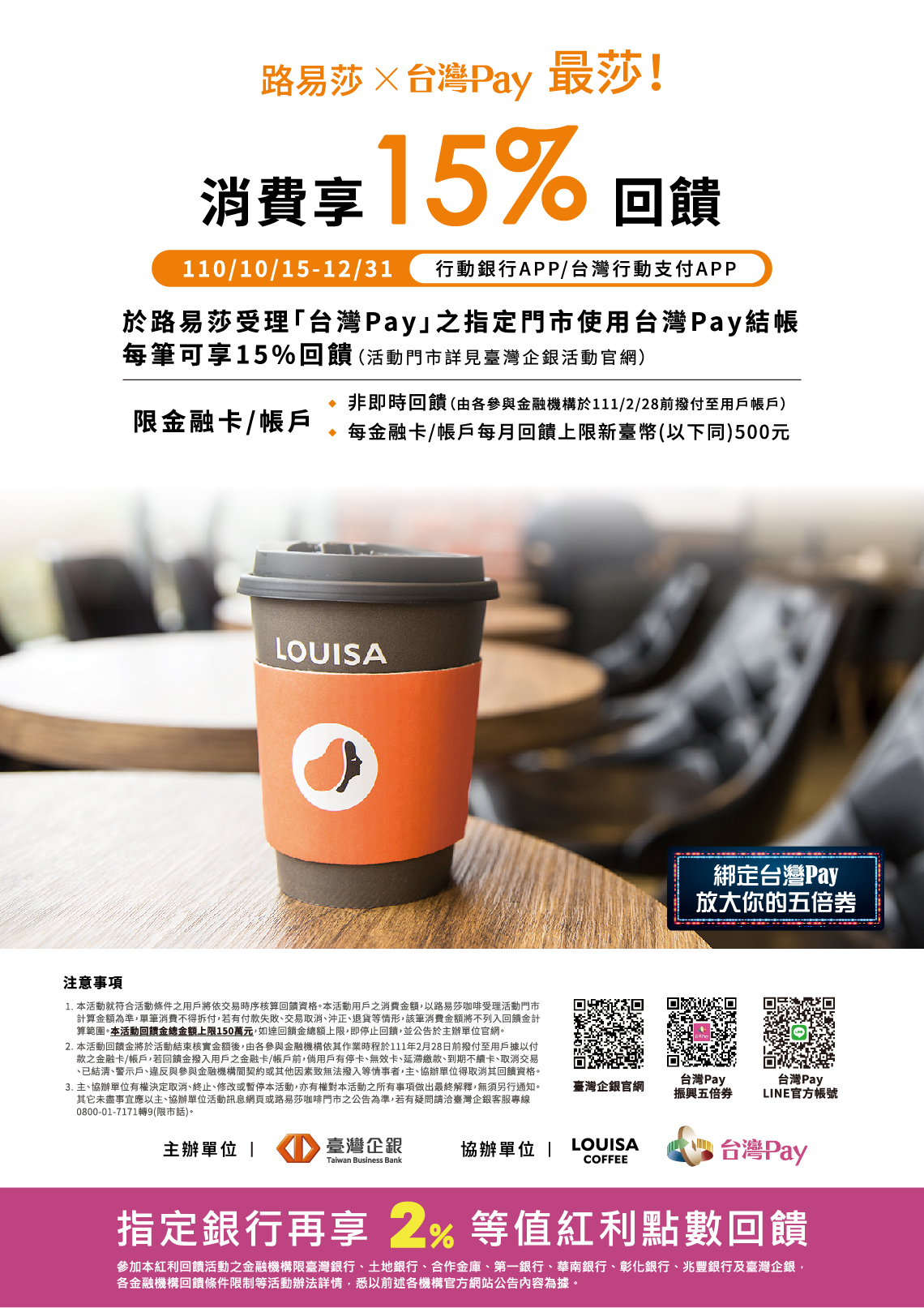 路易莎 x 台灣Pay 最莎!消費享15%回饋 2021-10-15 路易莎 x 台灣Pay 最莎!消費享15%回饋 單筆消費結帳享金額15%回饋,每月最高回饋新臺幣500元為限。 | 活動時間 | 2021/10/15 - 2021/12/31 | 活動地點 | 路易莎咖啡受理「台灣Pay」之指定門市。(參與本活動之門市如有更新,以台灣企銀官網公告為準)。 | 活動對象 | 使用「台灣Pay」(透過參與金融機構「行動銀行」APP 或「台灣行動支付」APP至活動地點,出示?台灣Pay?付款條碼(限金融卡/帳戶)進行支付之用戶(以下簡稱用戶)。 | 活動內容 | 活動期間至活動地點消費,出示?台灣Pay?付款條碼(限金融卡/帳戶)進行支付,享單筆消費結帳金額15%回饋(單筆消費不得拆付,非即時回饋,金額小數點後四捨五入),每一金融卡/帳戶每月最高回饋新臺幣(以下同)500元為限,本活動回饋總金額上限150萬元,額滿為止,並公告於主辦單位官網。 上一則 回到列表 下一則