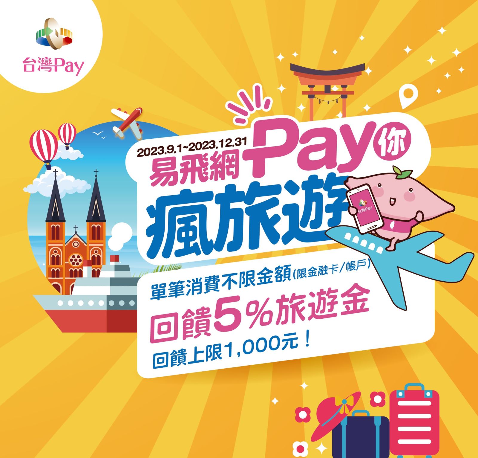 用戶於活動期間至活動地點使用「台灣Pay」進行消費支付,依單筆消費不限金額回饋5%易飛網旅遊金