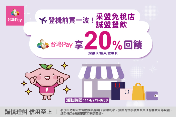 登機前買一波!采盟免稅店/誠盟餐飲 台灣Pay享20%回饋 2025-07-01 登機前買一波!采盟免稅店/誠盟餐飲 台灣Pay享20%回饋 活動時間 2025/07/01 - 2025/09/30 活動地點 采盟免稅店 (含桃園國際機場第二航廈、高雄國際機場及馬祖南竿機場) 、誠盟餐飲(含桃園國際機場第二航廈管制區D區3F/4F、非管制區1F/4F)受理「台灣Pay」之櫃位。 活動對象 使用「台灣Pay」(透過參與金融機構「行動銀行APP」或「台灣行動支付APP」)至活動地點消費並出示「台灣Pay」付款條碼(限金融卡/帳戶/信用卡) 進行支付(即被掃交易) (以下簡稱用戶)。 活動內容 活動期間至活動地點消費,出示「台灣Pay」付款條碼(即被掃交易,適用金融卡/帳戶/信用卡)進行支付,單筆消費不限金額享20%現金回饋(非即時回饋,小數點後無條件捨去),單筆交易回饋金上限新臺幣(以下同)2,000元。 *本活動回饋總金額以30萬元為上限,額滿為止,並公告於兆豐銀行官網,不另行通知。 上一則 回到列表 下一則