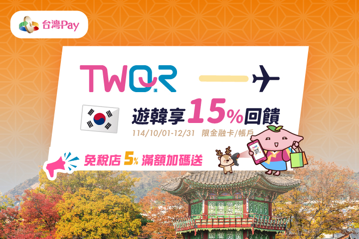 TWQR遊韓享15%回饋 2025-10-01 TWQR遊韓享15%回饋 活動時間 2025/10/01 - 2025/12/31 活動地點 韓國地區受理「台灣Pay」付款服務之店家。 活動對象 使用「台灣Pay」(透過參與金融機構「行動銀行APP」或「台灣行動支付APP」)韓國購物服務功能(限金融卡/帳戶),進行消費支付之用戶(以下簡稱用戶)。 活動內容 活動一:筆筆享15%回饋 活動期間至韓國地區受理「台灣Pay」付款服務之店家(店家清單詳台灣Pay官網,實際交易受理依現場狀況為準)消費,使用「台灣Pay」掃碼支付成功者,單筆交易不限金額(扣除沖正、退貨交易金額)可享15%之現金回饋(非即時回饋,小數點後四捨五入),每卡/帳戶每月最高回饋上限新臺幣(以下同)1,500元。 本活動每月回饋總金額上限75萬元整,依用戶交易時序核算回饋資格,額滿為止,並公告於台灣Pay官網。 活動二:免稅店5%滿額加碼送 活動期間於韓國地區新世界、現代、樂天免稅店受理「台灣Pay」付款服務之門市,使用「台灣Pay」QR Code支付,單月累積滿3,000元之交易者(扣除沖正、退貨交易金額),即可獲得加碼5%現金回饋(非即時回饋),每卡/帳戶每月回饋上限1,000元。 活動二每月回饋總金額上限20萬元整,各卡/帳戶之交易金額獨立計算,且不得跨月累計,依交易時序核算回饋資格,如達回饋總額上限,即停止回饋,並公告於台灣Pay官網。 上一則 回到列表 下一則